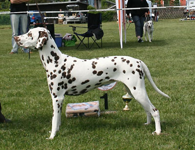 weiß-braune Hündin von richtiger Größe, im längeren Rechteck stehend, mittel getupft, gleichmäßig verteilt, geringfügig gesprenkelt, korrekt gewinkelte Hinterhand, sehr gut gestellte Vorderhand, knappe Brusttiefe, Kopf mit Gesichtszeichnung, mamorierte Behänge, Nasenschwamm und Augensaum vollständig geschlossen, korrekt angesetzte Rute, stärker aufgebogen, Rücken in der Bewegung etwas wippend, korrekter Bewegungsablauf, umgänglich im Wesen, vorzügliche Vorführung